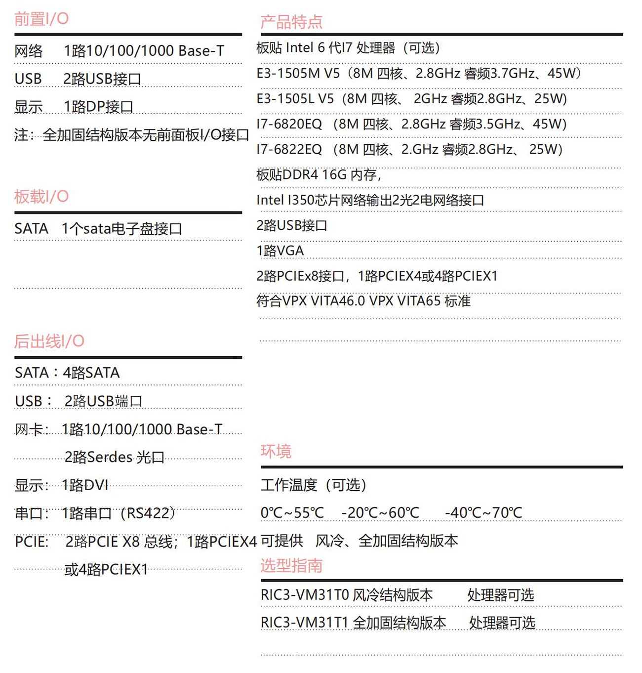 板貼第六代Intel Core I7處理器,Intel CM236芯片組, 表貼16GB DDR4 內存;具備高性能、高可用性、具備豐富的外圍接口; 3uVPX規格設計了高效的散熱系統,可顯著提高處理器的浮點運算 性能,以太網,PCIe擴展總線滿足視頻采集與處理、雷達和聲吶等應 用對高速數據傳輸的要求。專為惡劣環境使用而設計支持寬溫工作。